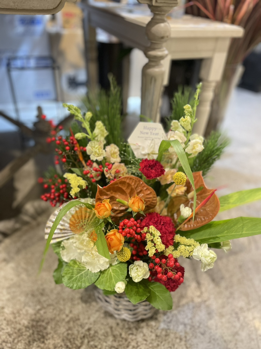 明るいお花を使用した豪華なアレンジメント。開店祝いや、昇進祝い、お誕生日ギフトなど華やかなシーンを彩る存在感のあるアレンジメントです。