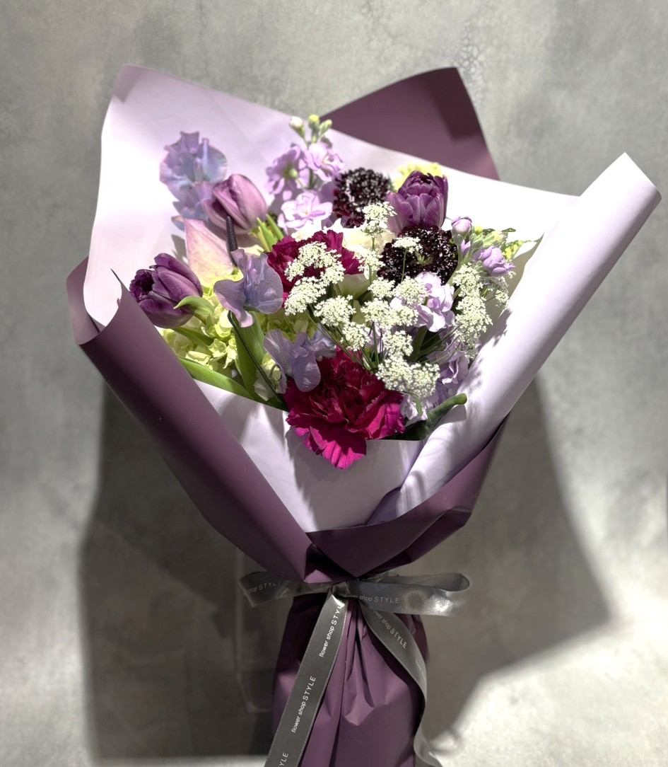 花だけでなく、ラッピング材も一体となってブーケ全体のデザインとなっているのが特徴です。